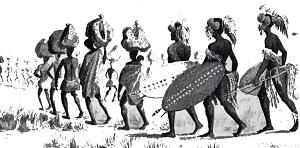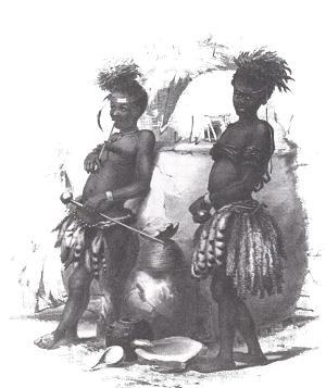 | Those Nguni who forged on soon discovered the country of their dreams - fertile land, mighty rivers, tributaries and streams, nutritious pastures, relief from the merciless tropical heat of their migration and, more importantly perhaps, an absence of the livestock- debilitating tsetse-fly endemic further north. They dispersed and settled in small groups all over this new territory...putting the Bushman lifestyle under extreme pressure and compelling the Lala people to integrate or move on. | |